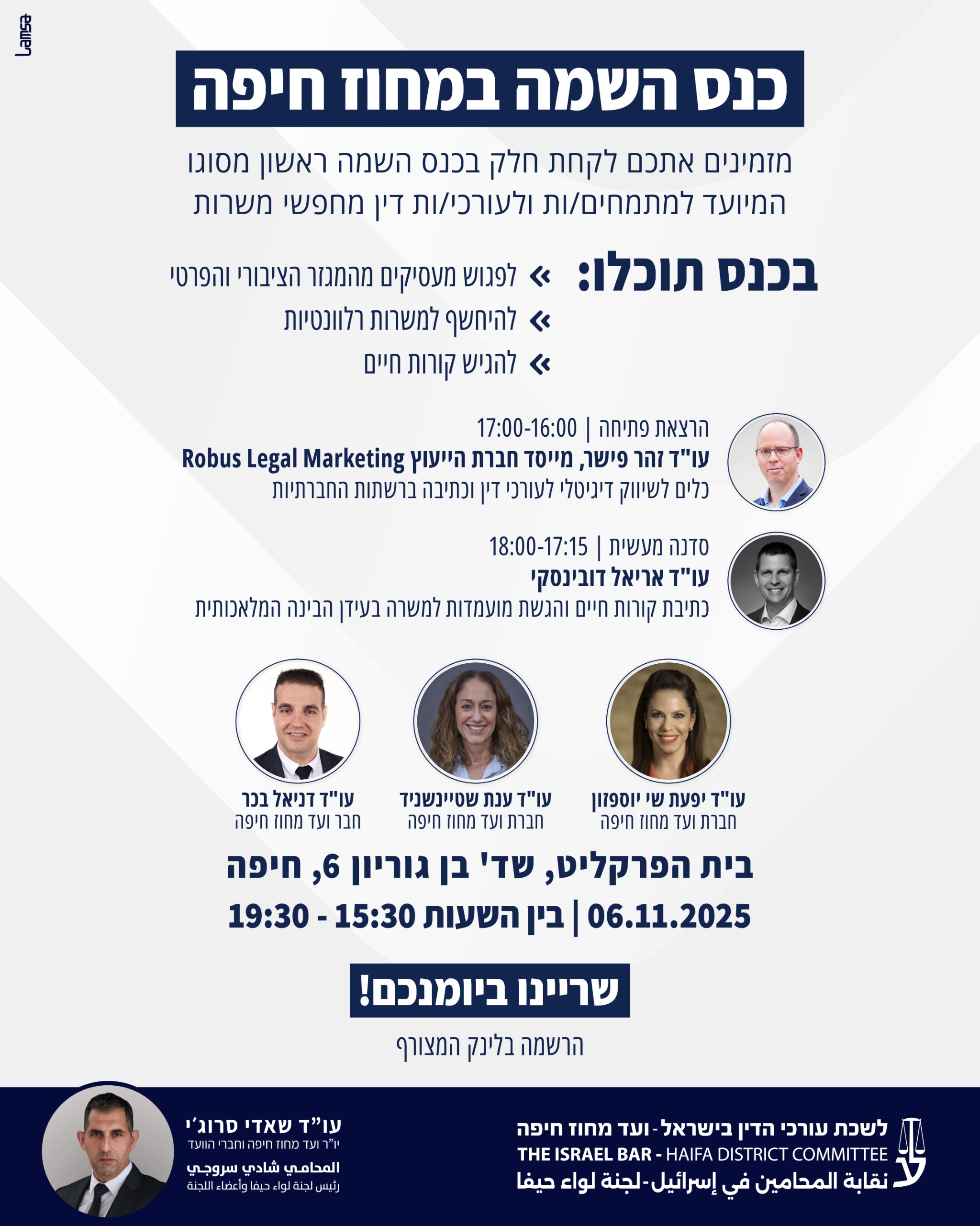 מזמינים אתכם לקחת חלק בכנס השמה ראשון מסוגו המיועד למתמחים/ות ולעורכי/ות דין מחפשי משרות