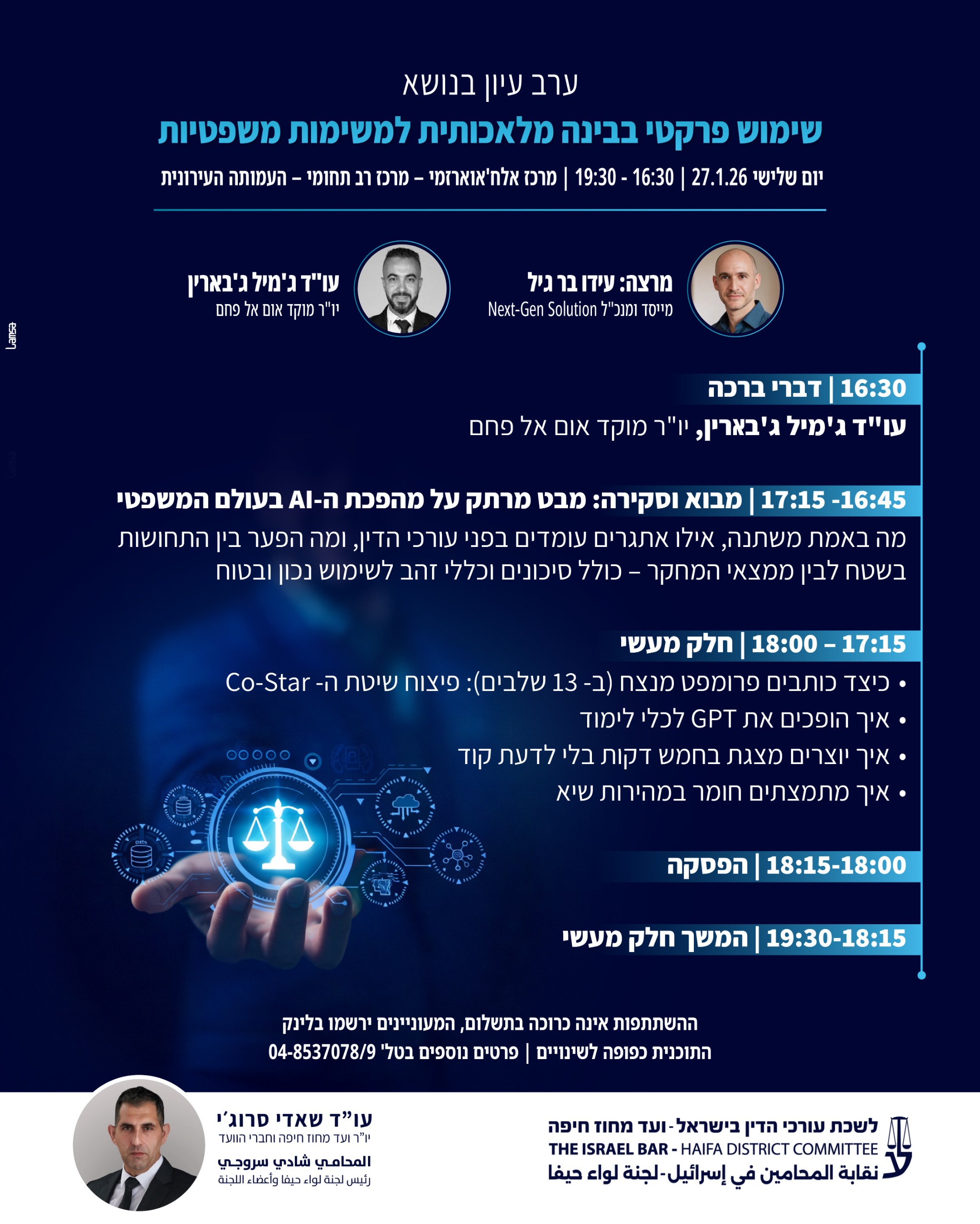 16:45- 17:15 | מבוא וסקירה: מבט מרתק על מהפכת ה-AI בעולם המשפטי: מה באמת משתנה, אילו אתגרים עומדים בפני עורכי הדין, ומה הפער בין התחושות בשטח לבין ממצאי המחקר – כולל סיכונים וכללי זהב לשימוש נכון ובטוח.